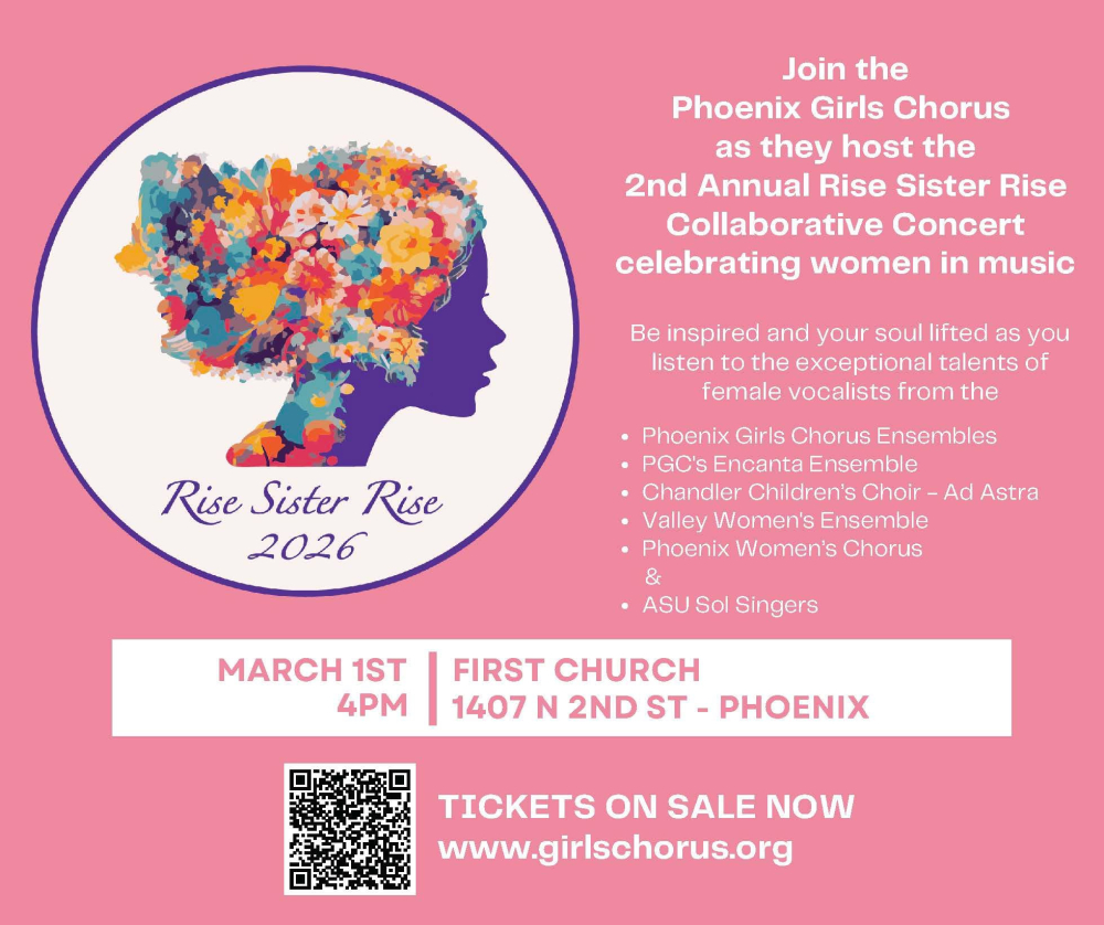 We're so excited to join women's and girl's choirs from around the Valley for Phoenix Girls Chorus' Rise Sister Rise Concert! We'll be singing 2 pieces on the program by @mormolyke and Andrea Ramey. All choirs will join together in a big closer!